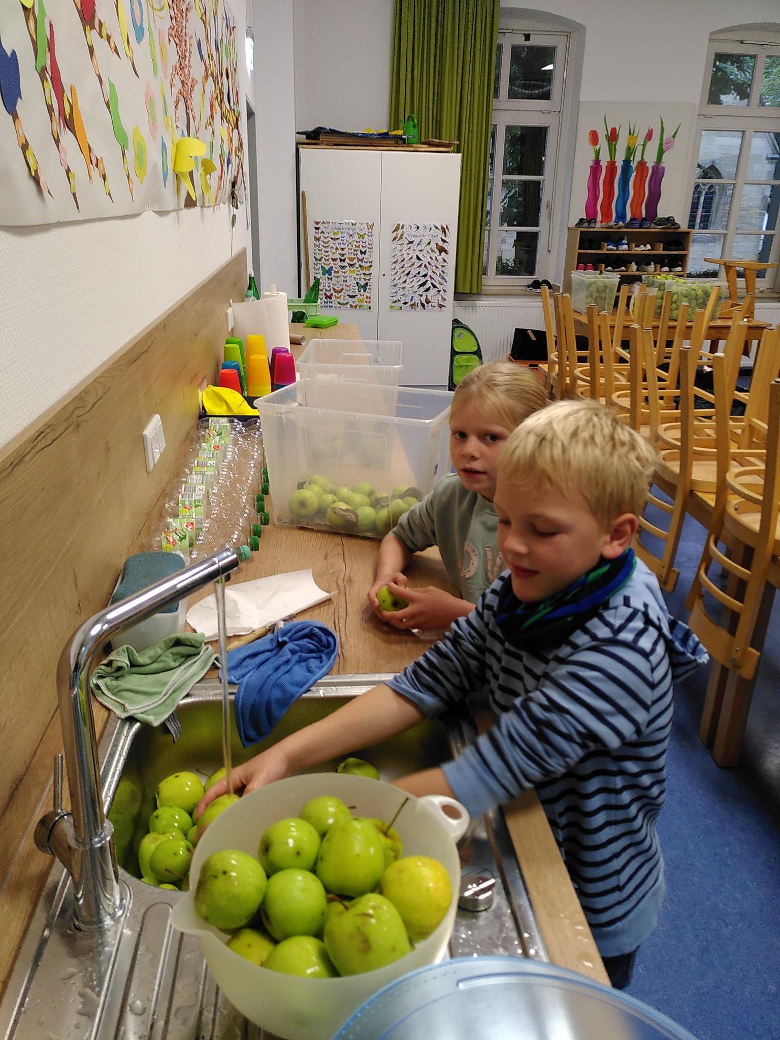 Nachdem drei große Kisten Äpfel geplückt waren, hieß zuerst: "Die Ware waschen". Im Anschluss wurden die Äpfel dann in Handarbeit in Viertel geteilt.