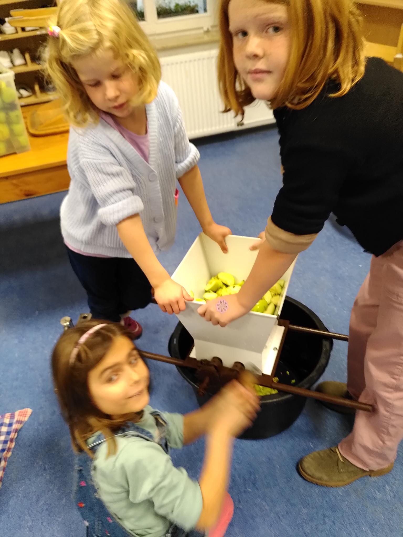 Dann war Muskelkraft gefragt. Die Apfelstücke kamen in die Saftpresse und mussten nun mit vereinten Kräften zu Saft gepresst werden. Dies war durchaus schweißtreibend-aber es hat sich gelohnt.